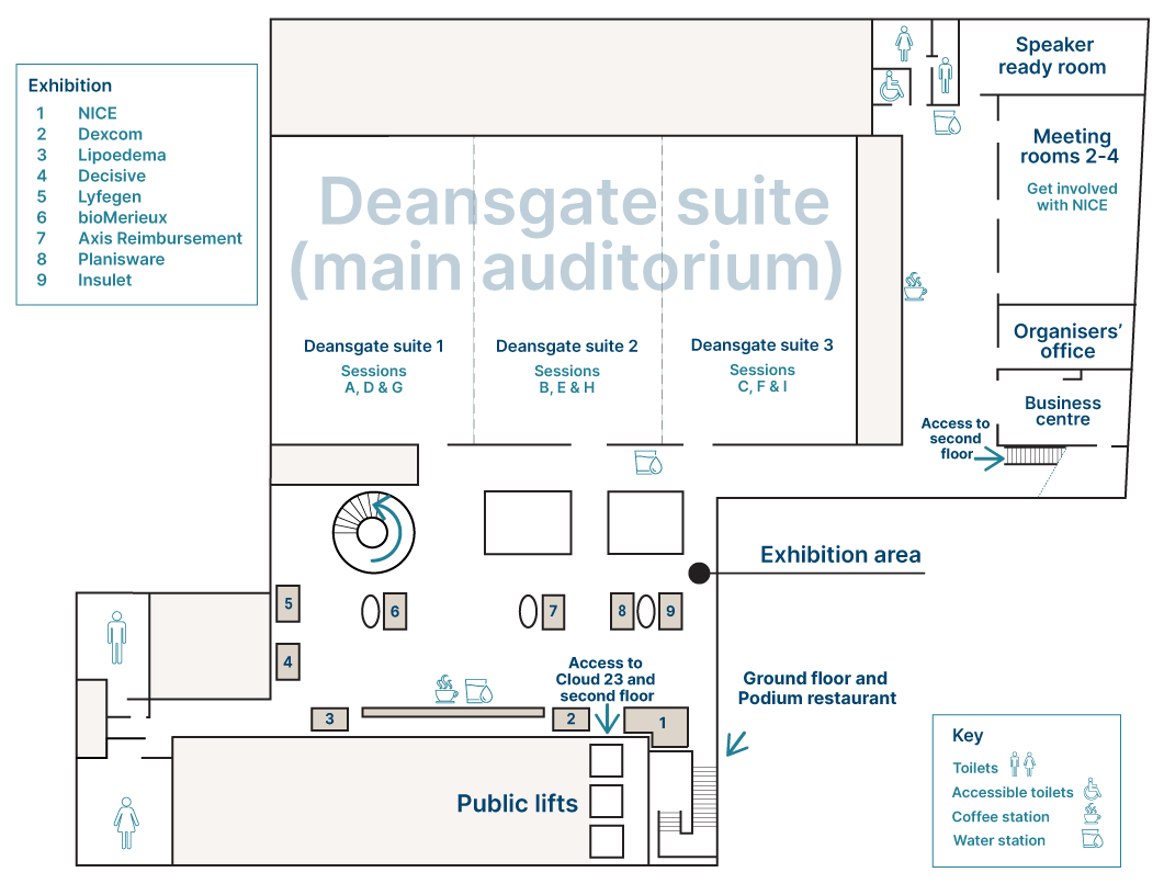 Exhibition area, speaker ready and organisers' room, main conference rooms, refreshments and toilets.
