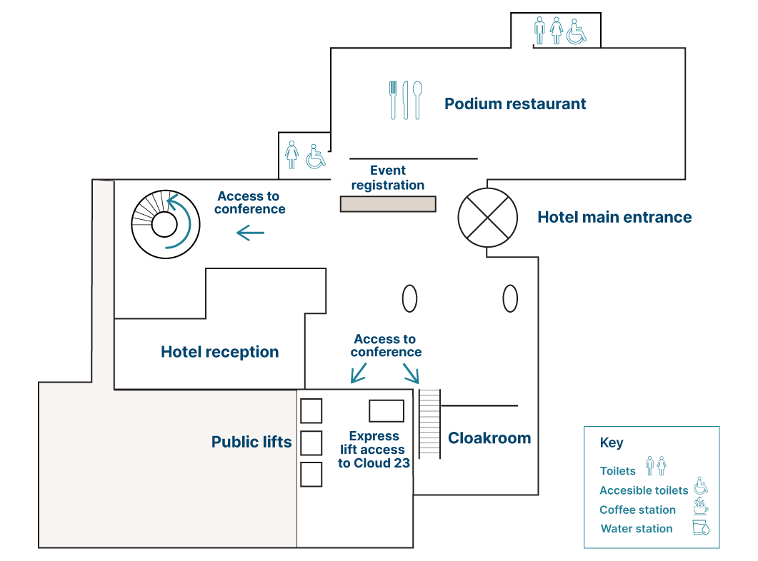 Cloud 23: Located on the 23rd floor of the venue. Those who have chosen this location will have C23 next to their sessions on their badge. Please note that space in Cloud 23 is limited, and availability is on a first-come, first-served basis during the registration process. Access to the restaurant can be via the lifts near the exhibition area or the Cloud 23 express lift on the ground floor, opposite the hotel reception.